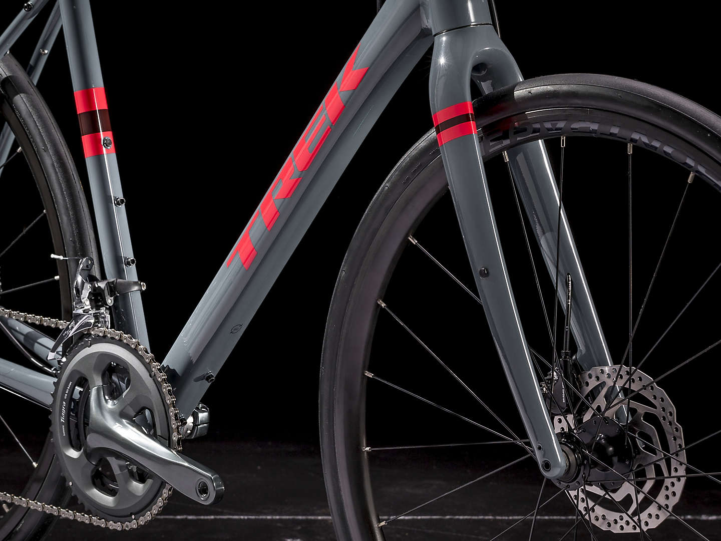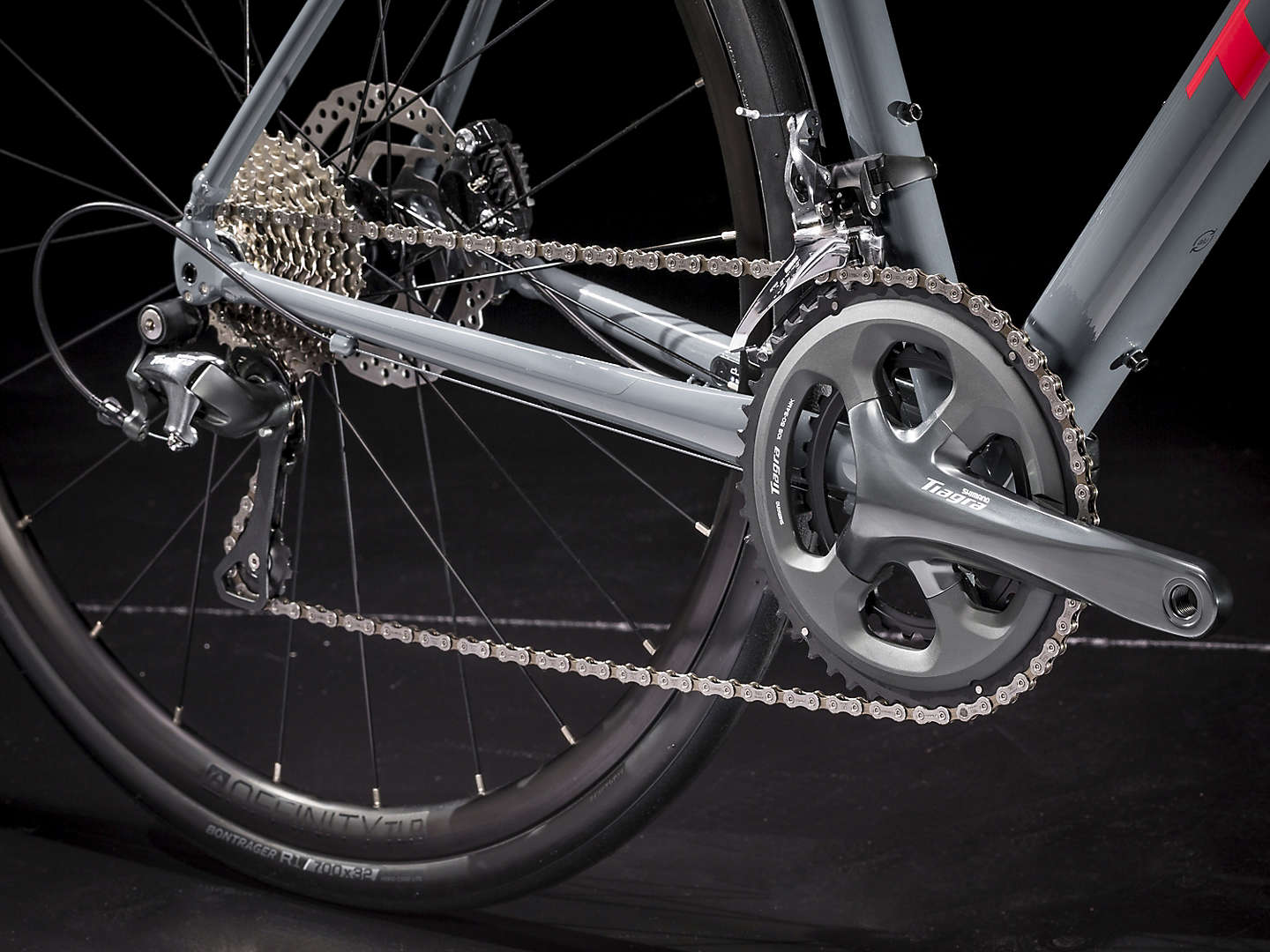 広いタイヤクリアランスを備えた200 Series Alpha アルミフレーム、カーボンディスクフォーク、前後12mm スルーアクスル、Shimano Tiagra 2×10速ドライブトレイン、フェンダーとラックマウント、天候を問わず高い制動力を誇る油圧ディスクブレーキ、チューブレスレディホイール、ボントレガー R1 Hard-Case Lite 700x32c タイヤ。
